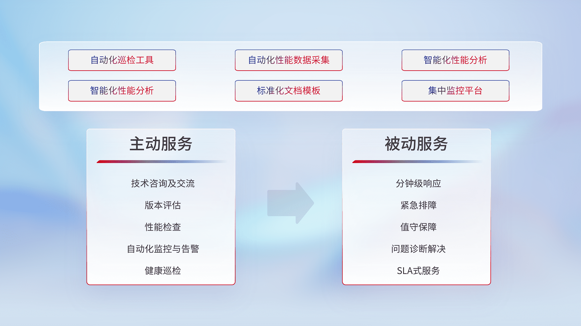 智能化工具和标准化文档,,,,保障服务质量,,,,提供主动服务(包含技术咨询、、、版本评估、、、、性能检查、、自动化监控与告警、、健康巡检)和被动服务包含(分钟级响应、、、、紧急排障、、、、值守保障、、、问题诊断解决、、SLA服务)。。